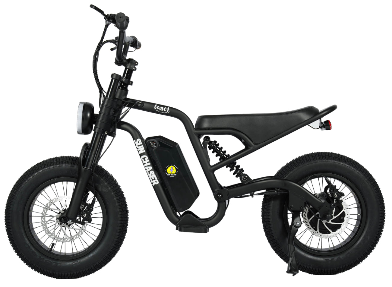 The Comet from Sun Chaser is all about one thing, fun. Designed specifically for kids who love adventure, this pedal-free electric bike delivers smooth power, confidence, and off-road capability in a compact 16-inch platform.